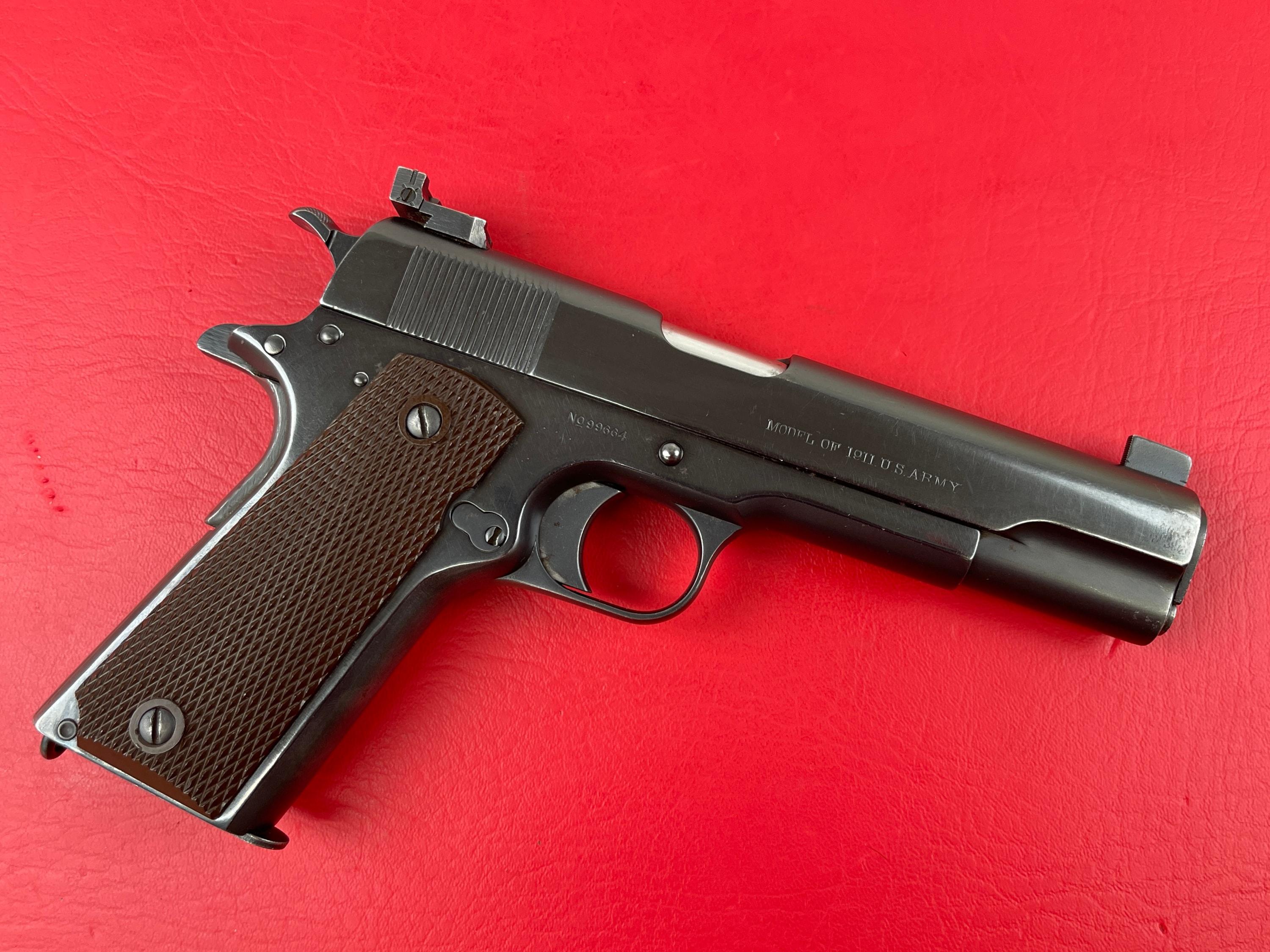 Colt 1911 U.S. Army National Match .45 ACP – Mfg. 1914. In good condition for its age with some bluing wear. Features brown checkered plastic grips and a clean, excellent bore. This pistol is not original.