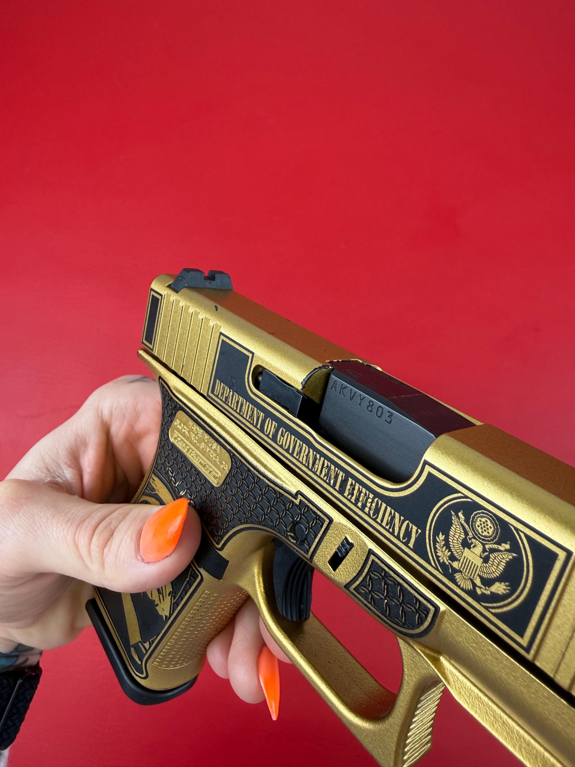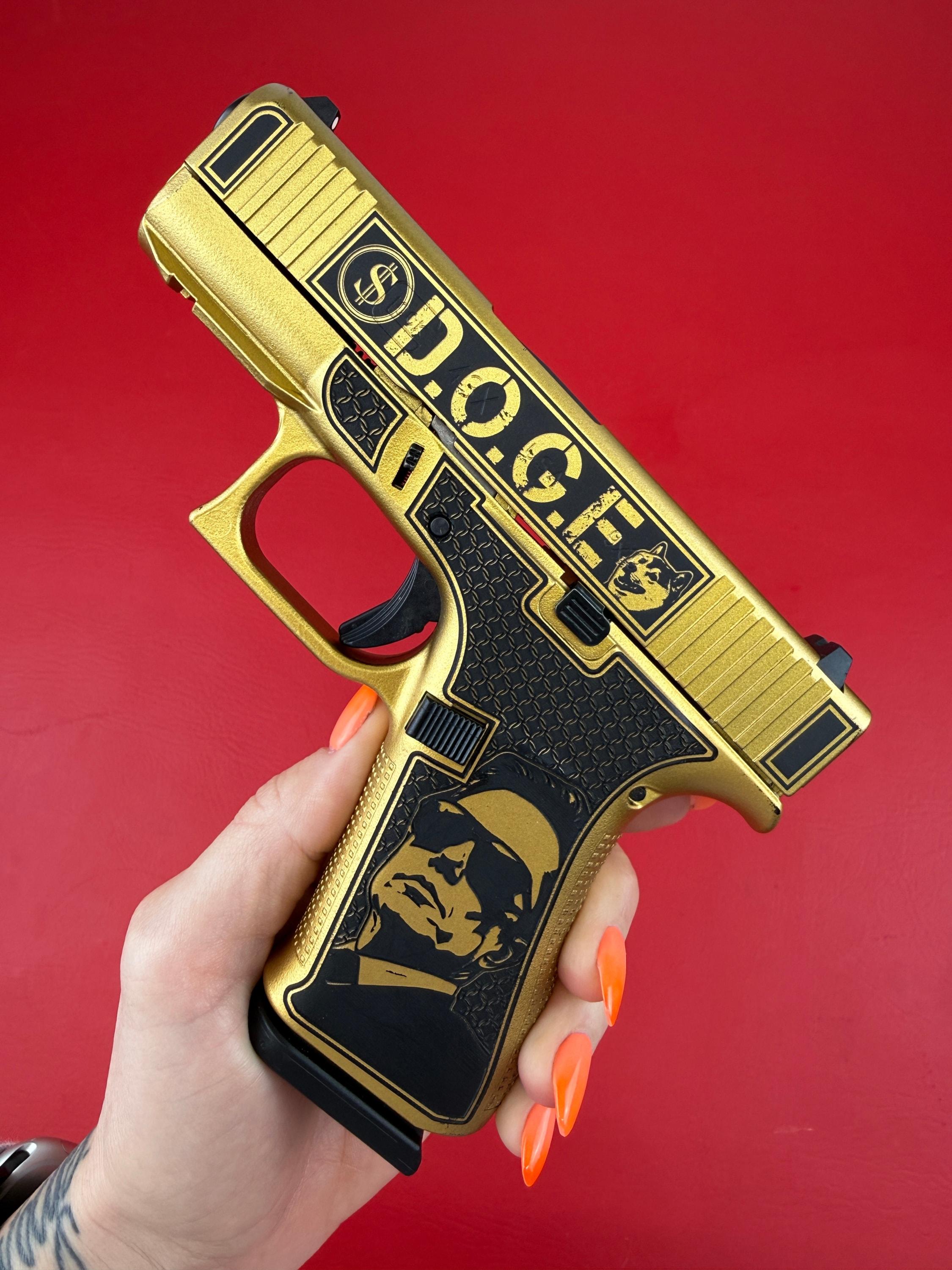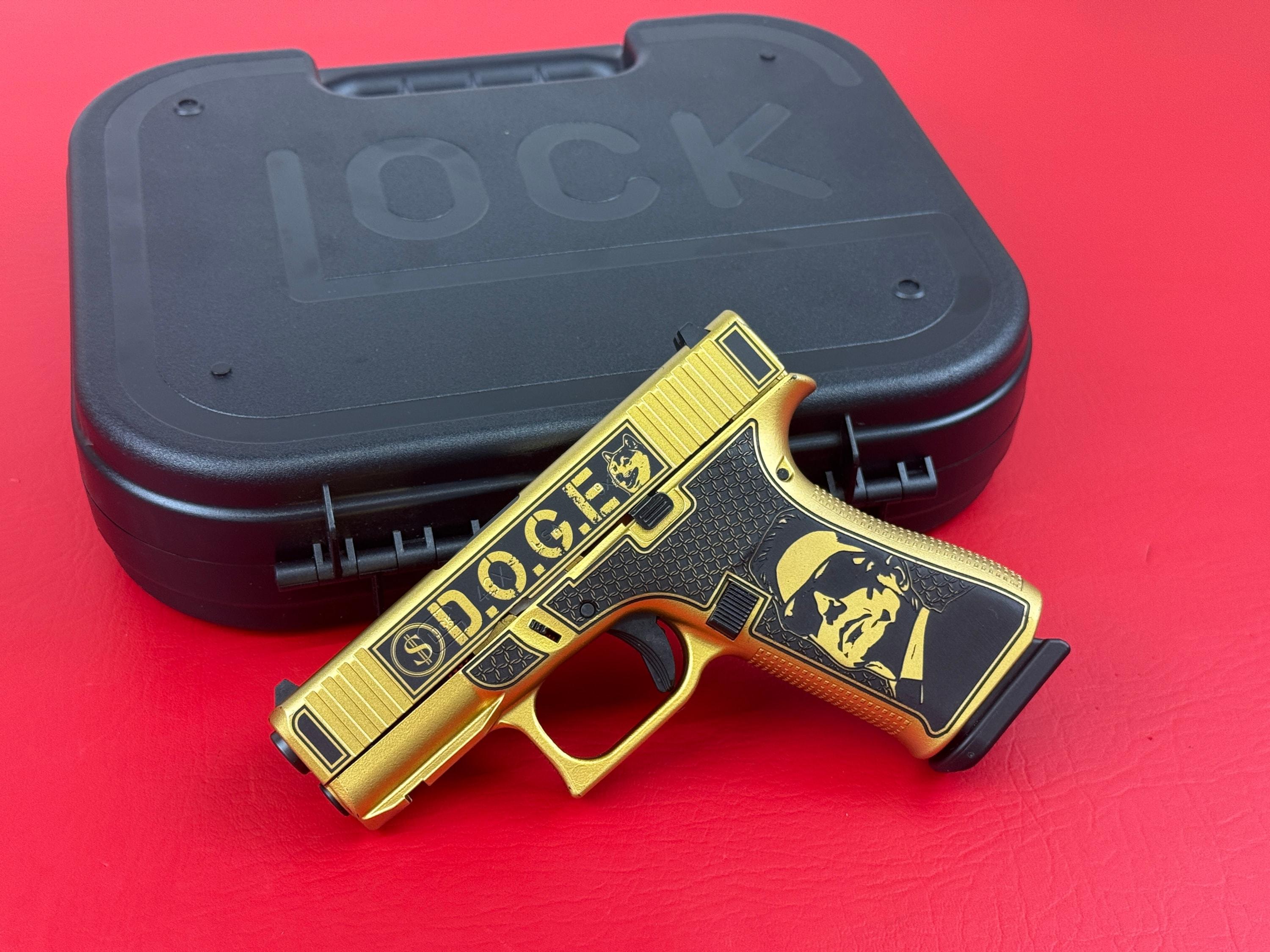 The G43X Gen5 D.O.G.E. features an all-Glamour Glock gold finish with "D.O.G.E" and Elon on one side and Trump with the "Department of Government Efficiency" on the other. The finish has a couple flaws on the top on the slide. Nothing to significant. See pictures.