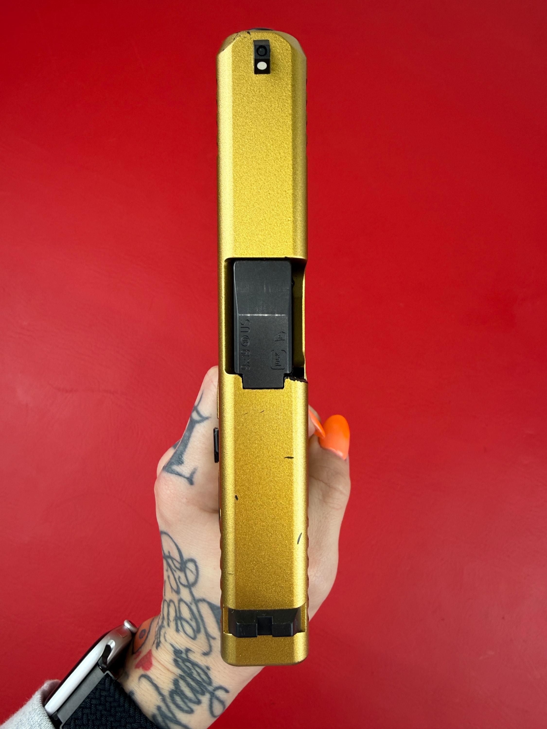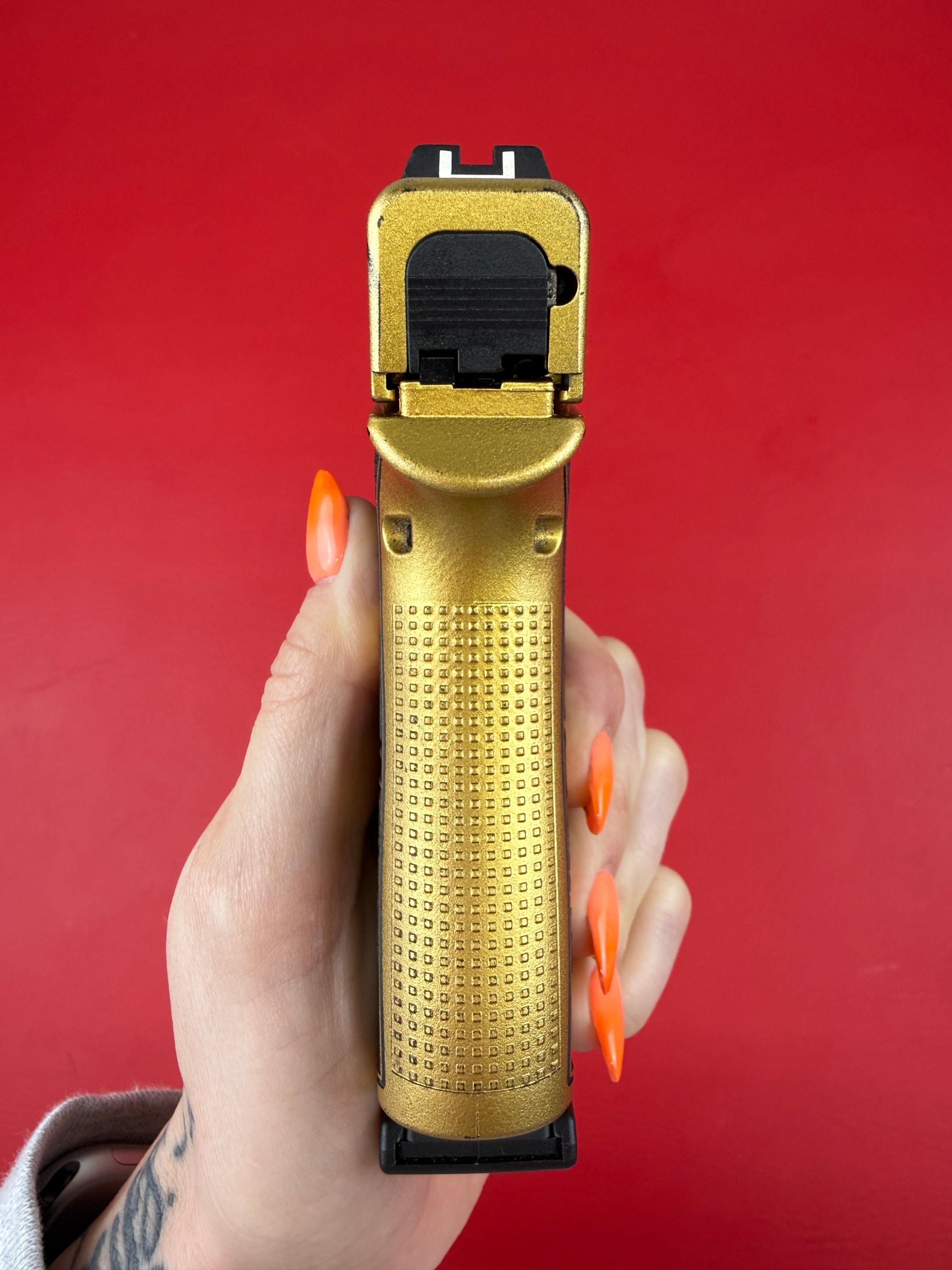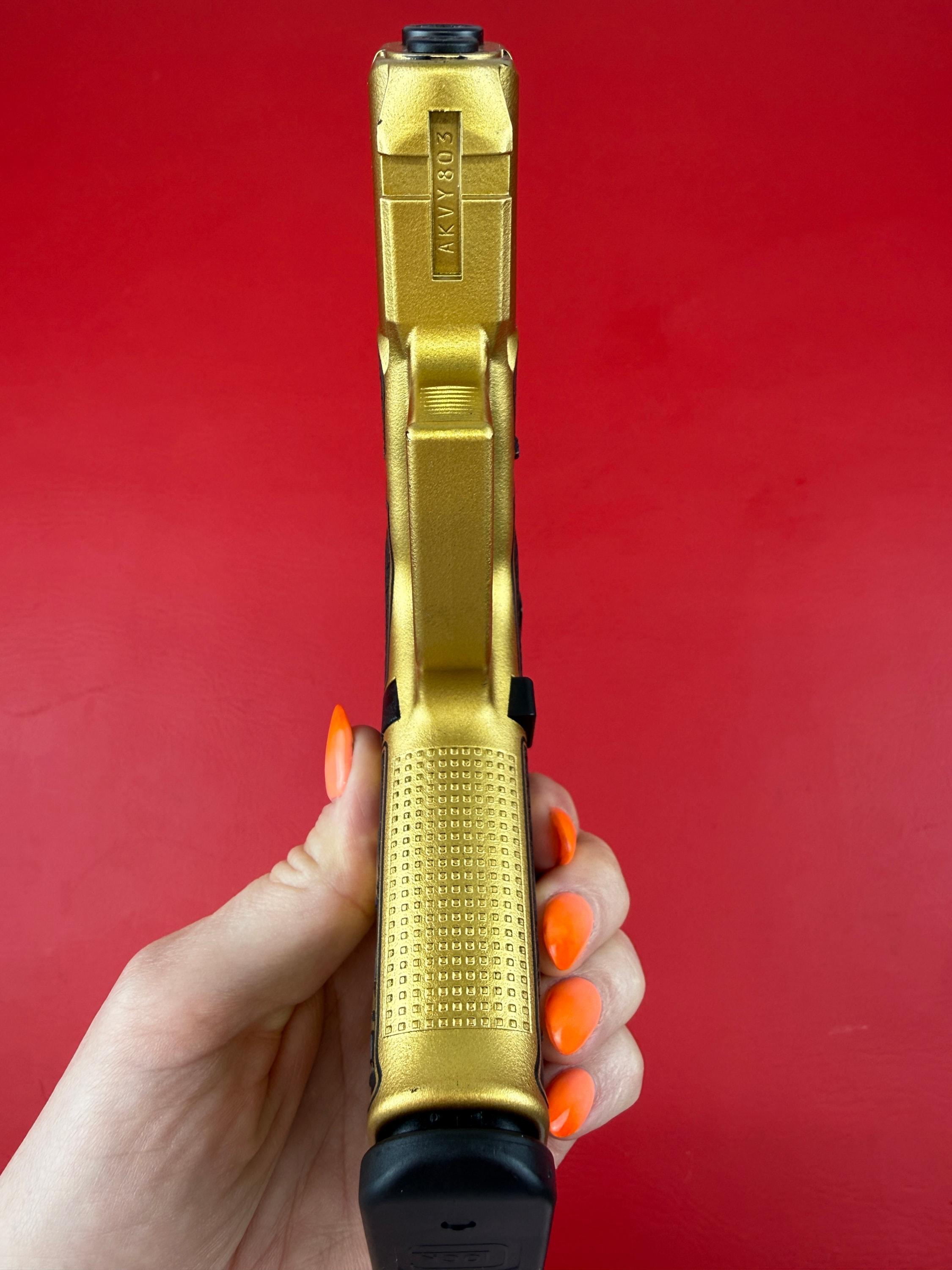 The G43X Gen5 D.O.G.E. features an all-Glamour Glock gold finish with "D.O.G.E" and Elon on one side and Trump with the "Department of Government Efficiency" on the other. The finish has a couple flaws on the top on the slide. Nothing to significant. See pictures.