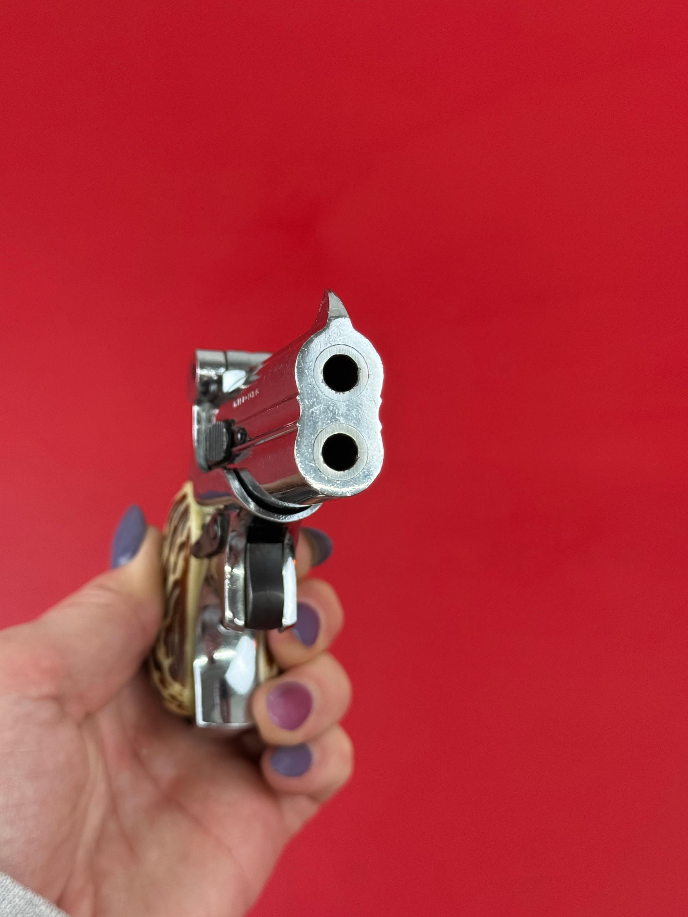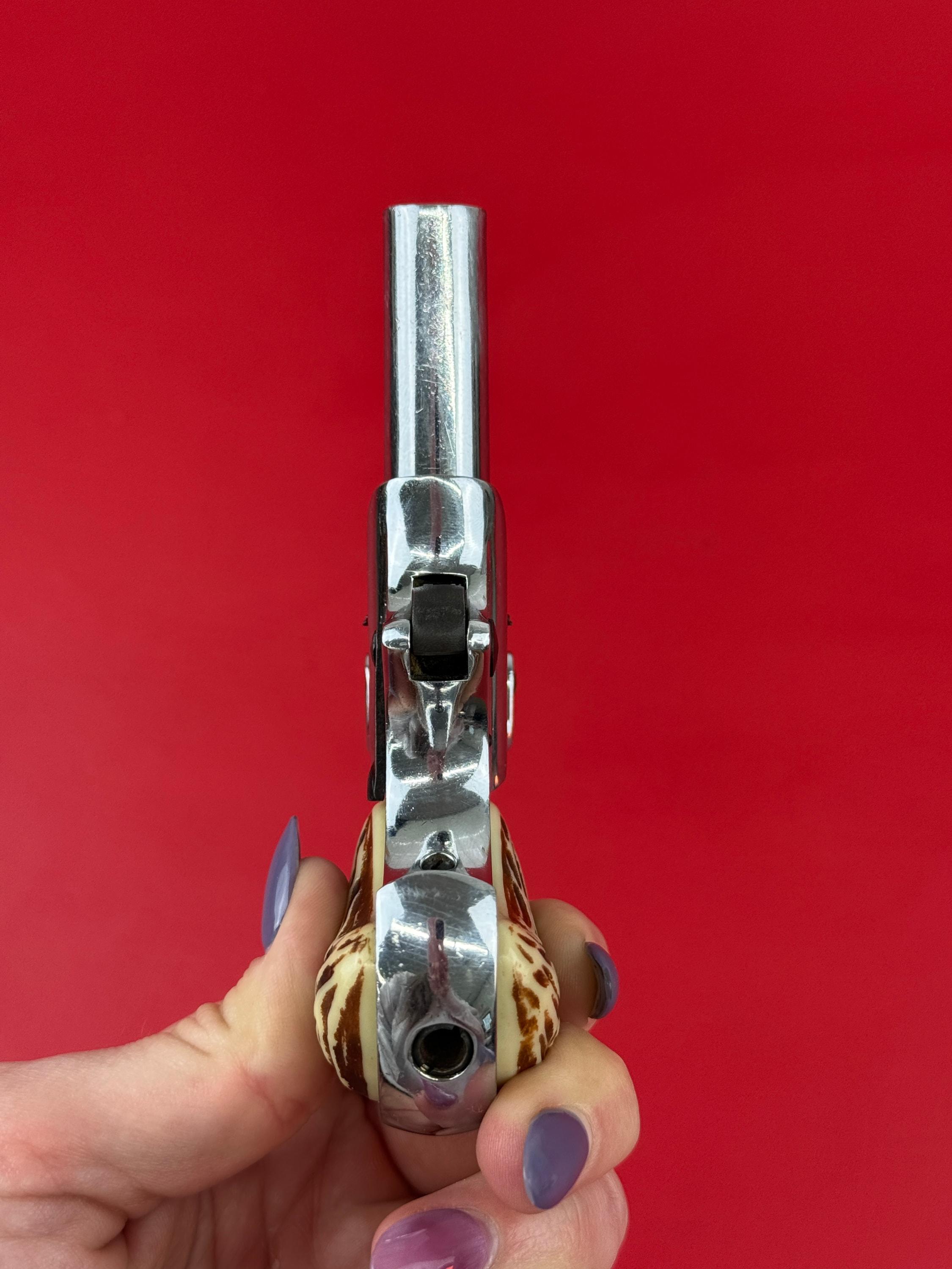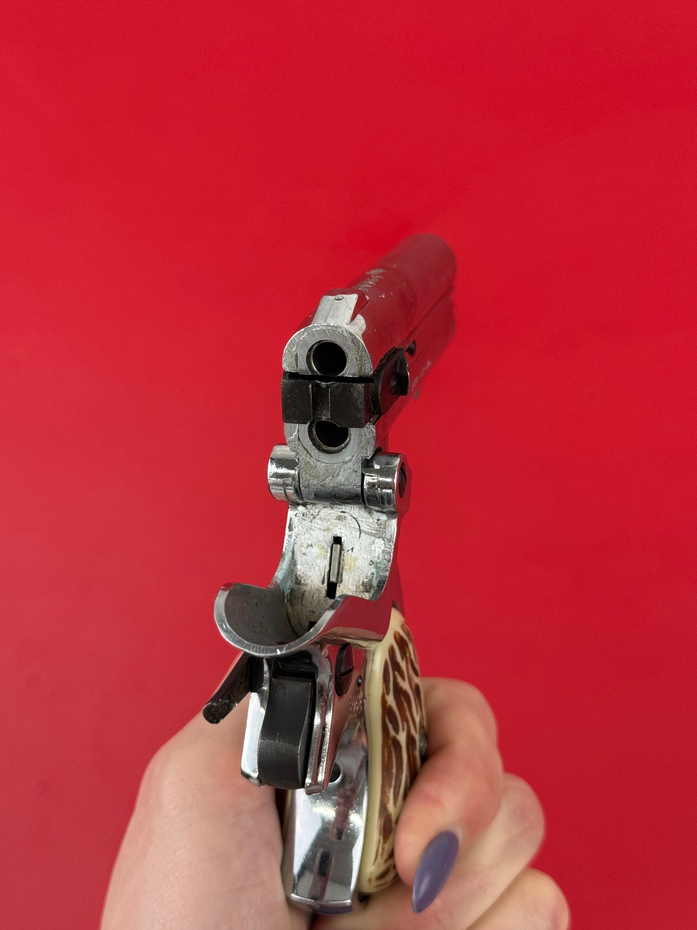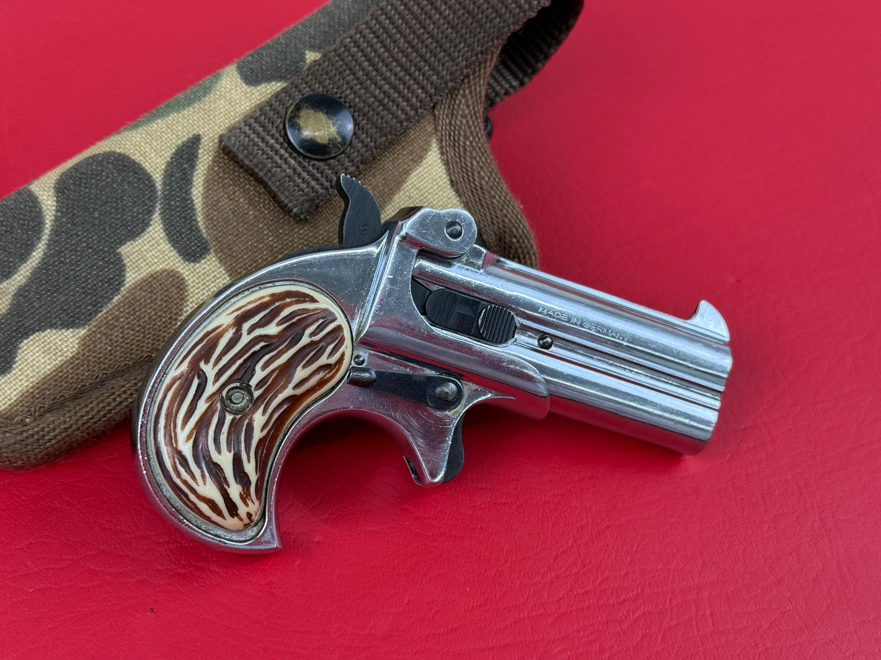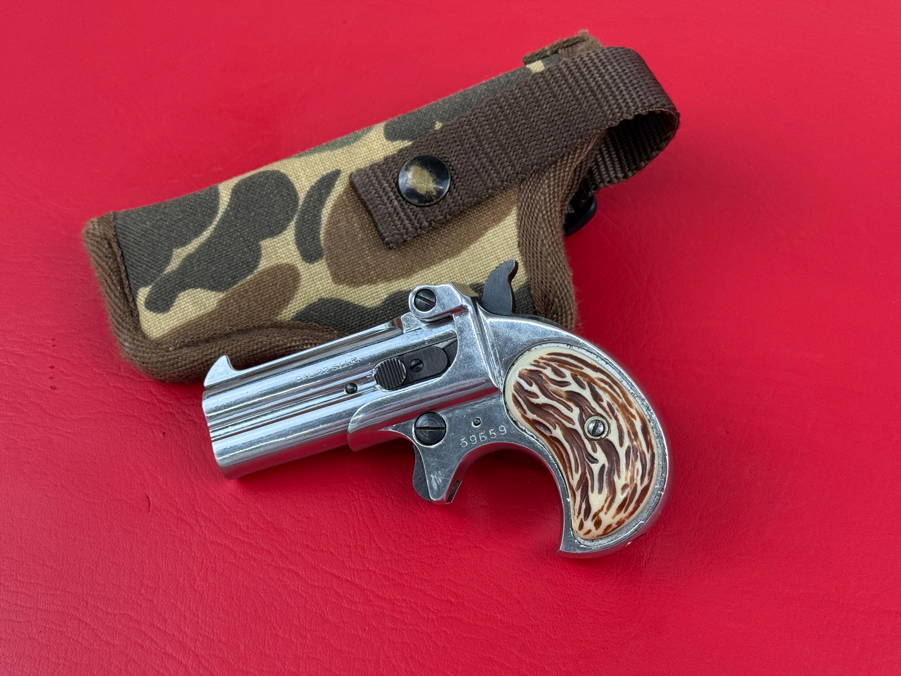 Mississippi Derringer .22 S,L,LR. Made in Germany - Polished Stainless finish overall looks pretty good, light handling marks throughout. Functions as it should. Comes with a little camo fabric holster.
