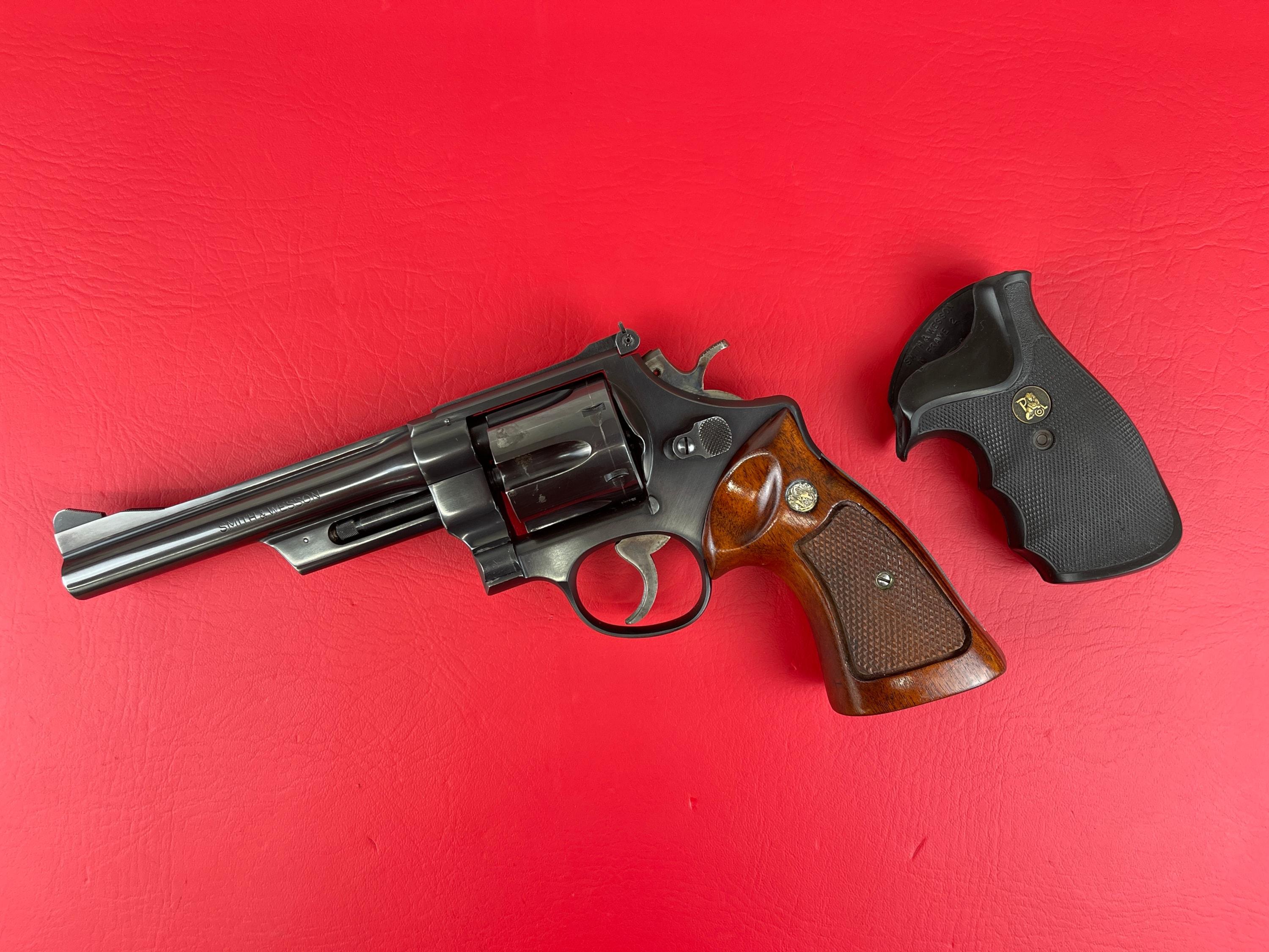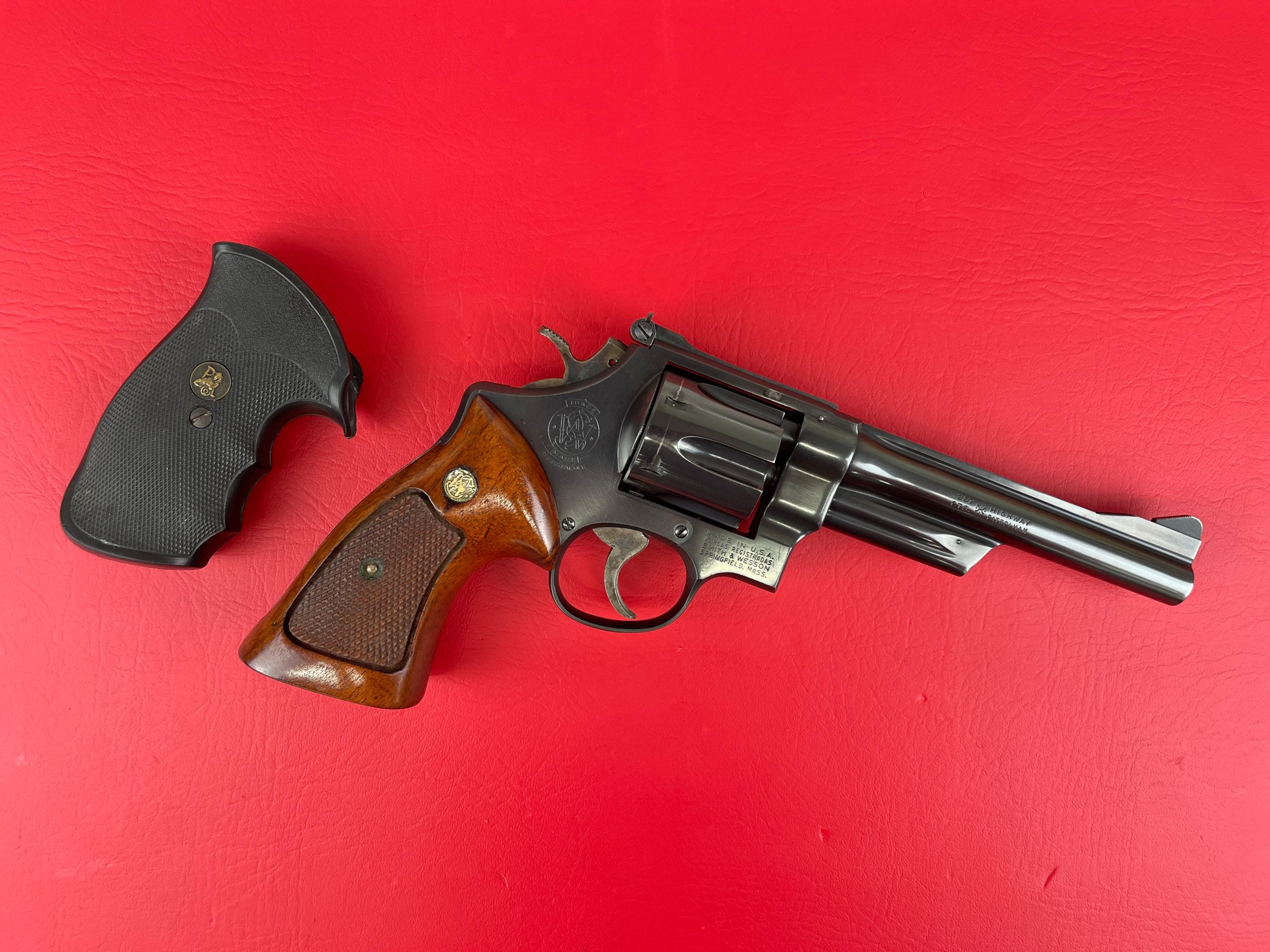 This Smith & Wesson Model 28-2 Highway Patrolman, chambered in .357 Magnum, is in very good condition. The blued finish is very nice, showing only light signs of use and well-preserved overall. It features original checkered wooden grips in very good condition, adding to its classic appeal, and also includes an extra set of black rubber grips for added versatility. Mechanically excellent with a smooth action, this revolver is a fine example of S&W’s renowned craftsmanship—ideal for both collectors and shooters alike.