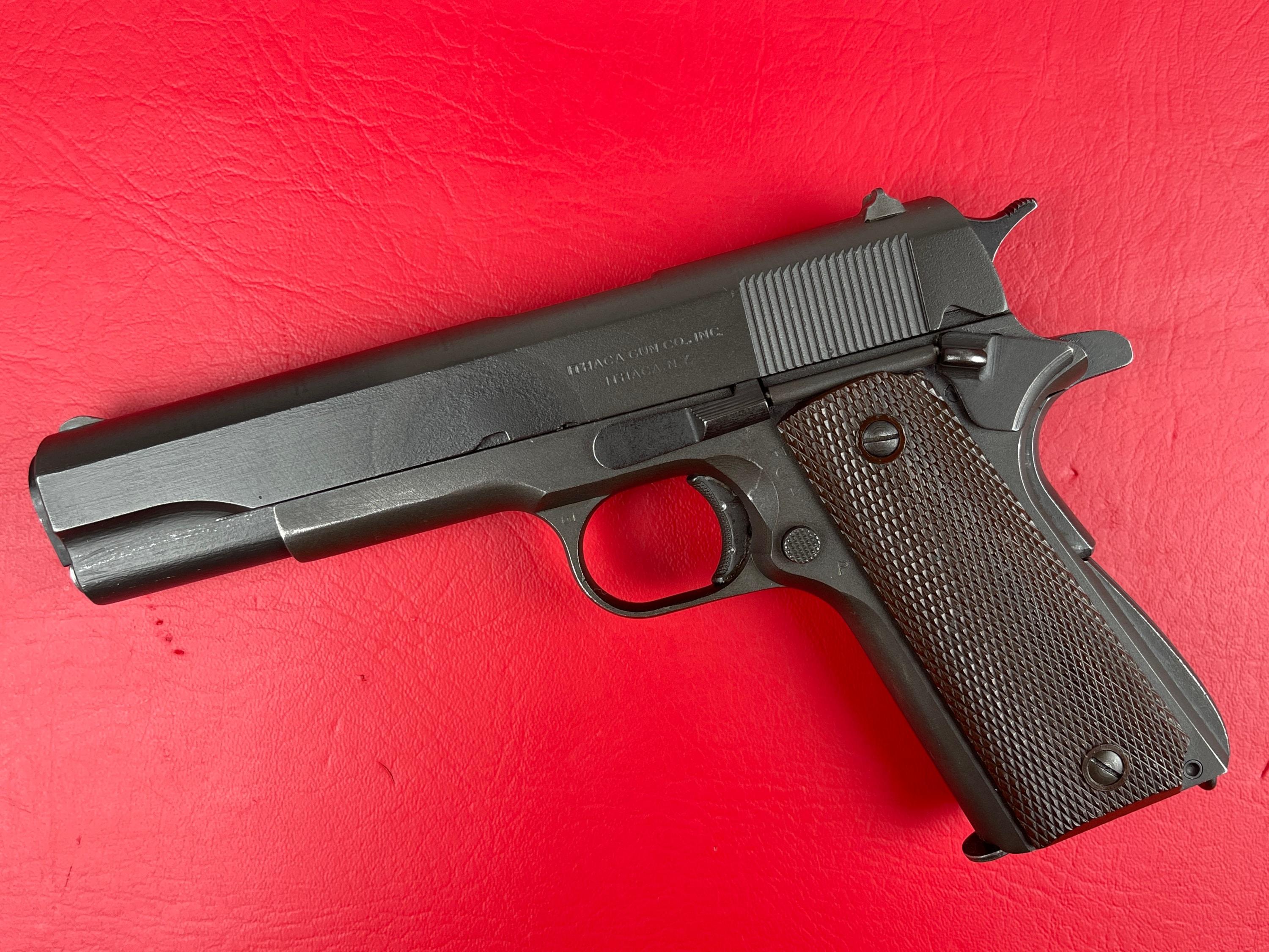 WWII Remington Rand M1911A1 U.S. Army pistol, chambered in .45 ACP, featuring an Ithaca-produced upper. Rebuilt at Rock Island Arsenal in 1945, the pistol bears the correct FJA inspector stamp on the left frame, P proof marks, and the RIA rebuild stamp with crossed cannons. Assembled with proper WWII-era components consistent with late-war production and U.S. Army rebuild standards.