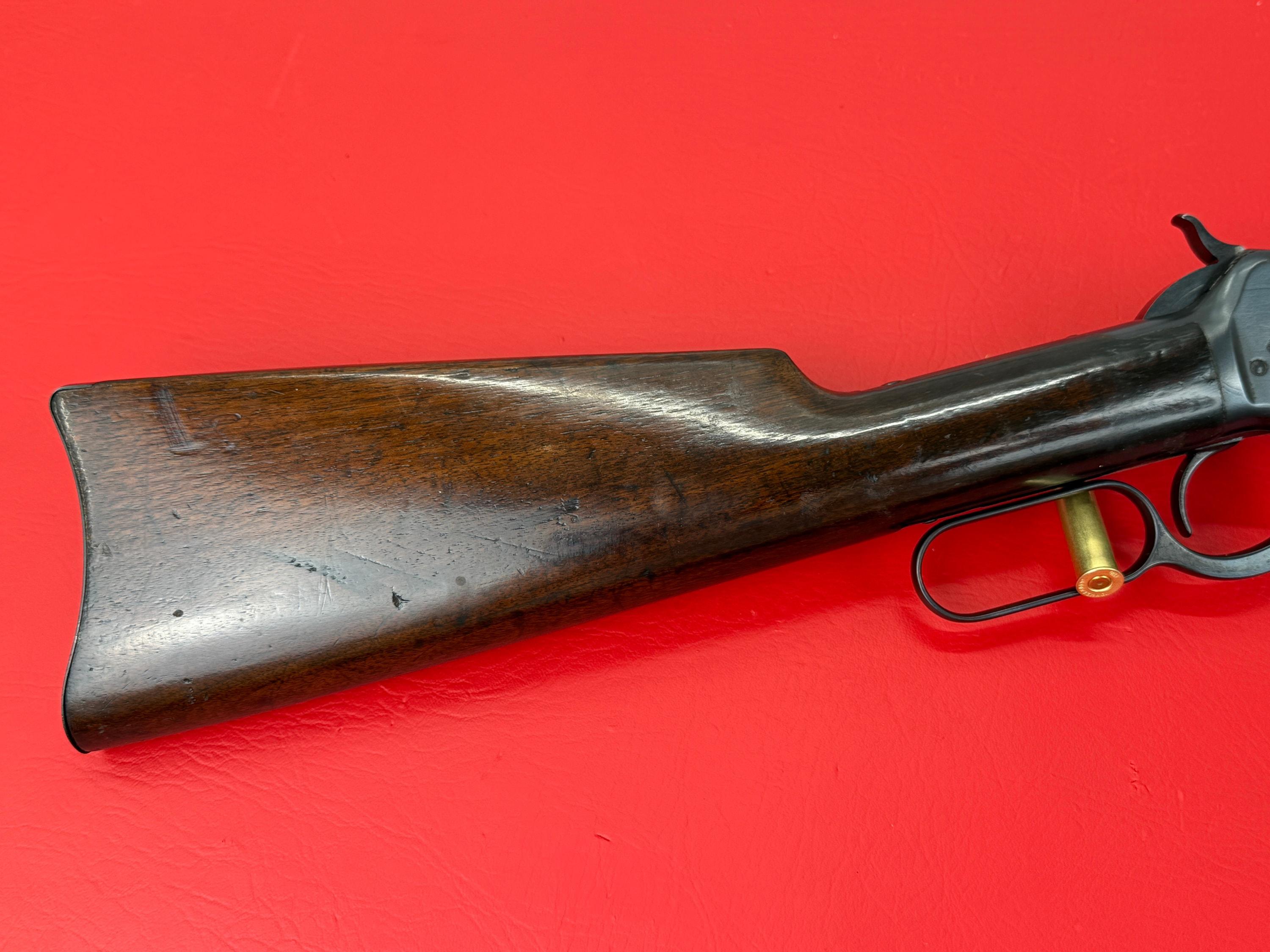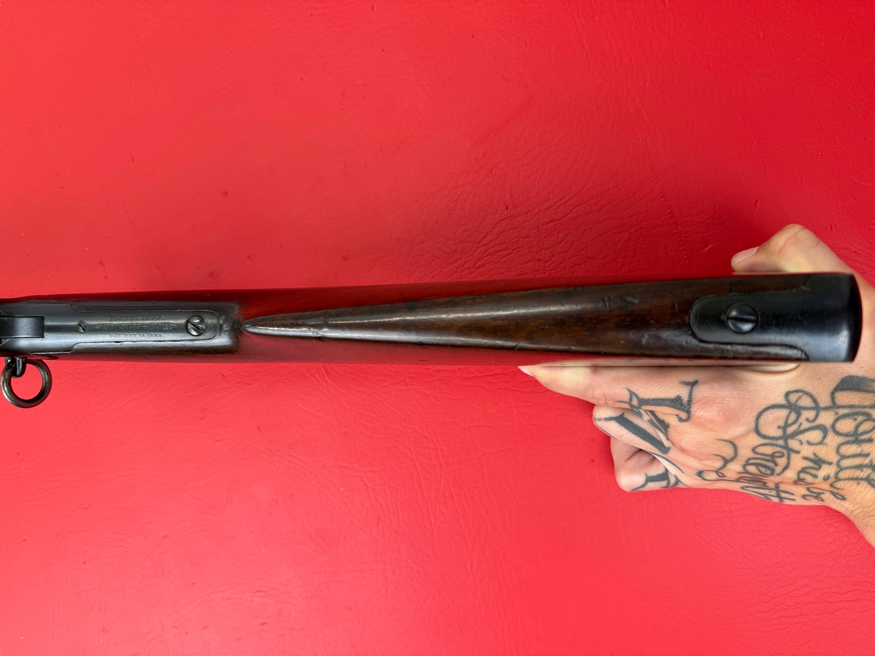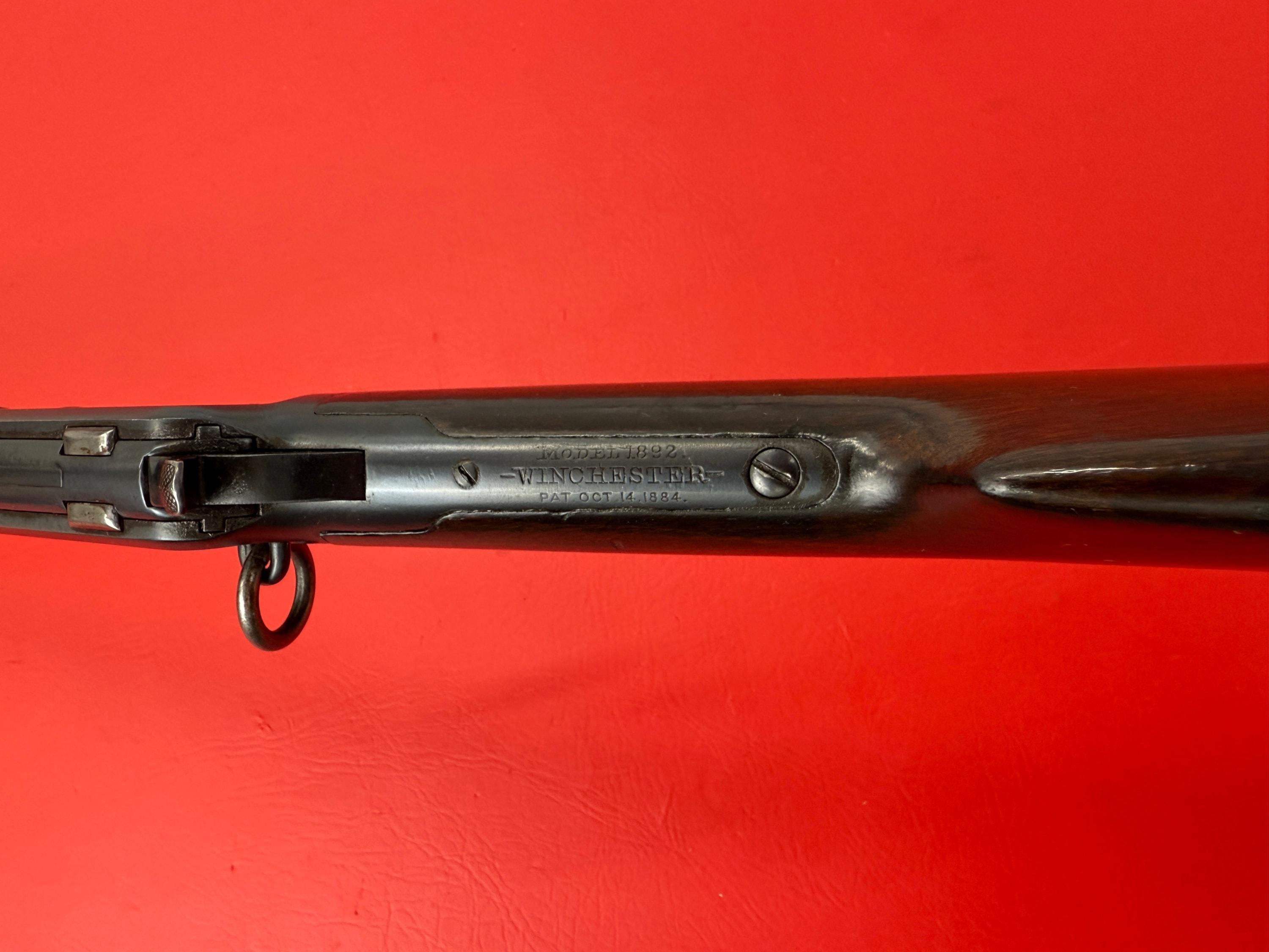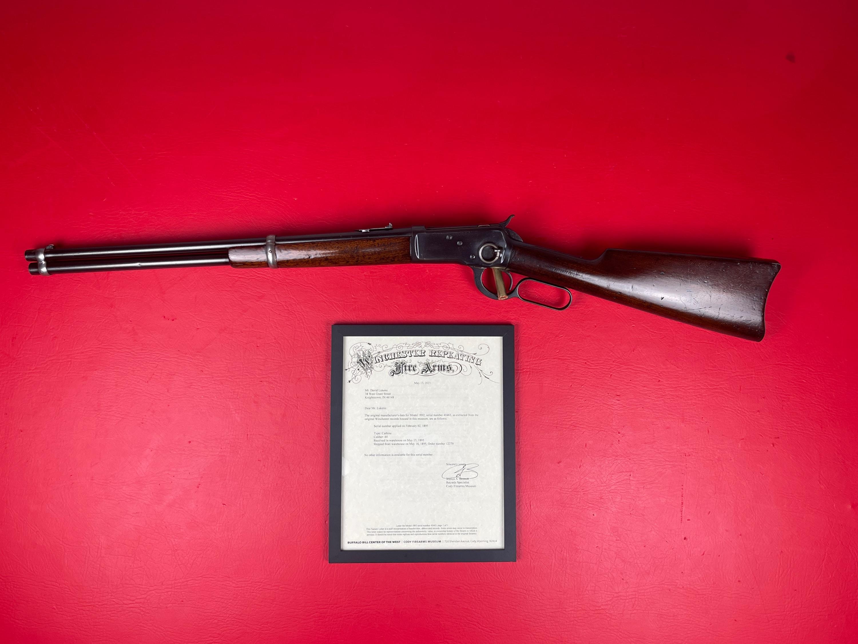 The 1893 Winchester Model 1892 is a 44-40 caliber saddle ring carbine with a 20-inch barrel.