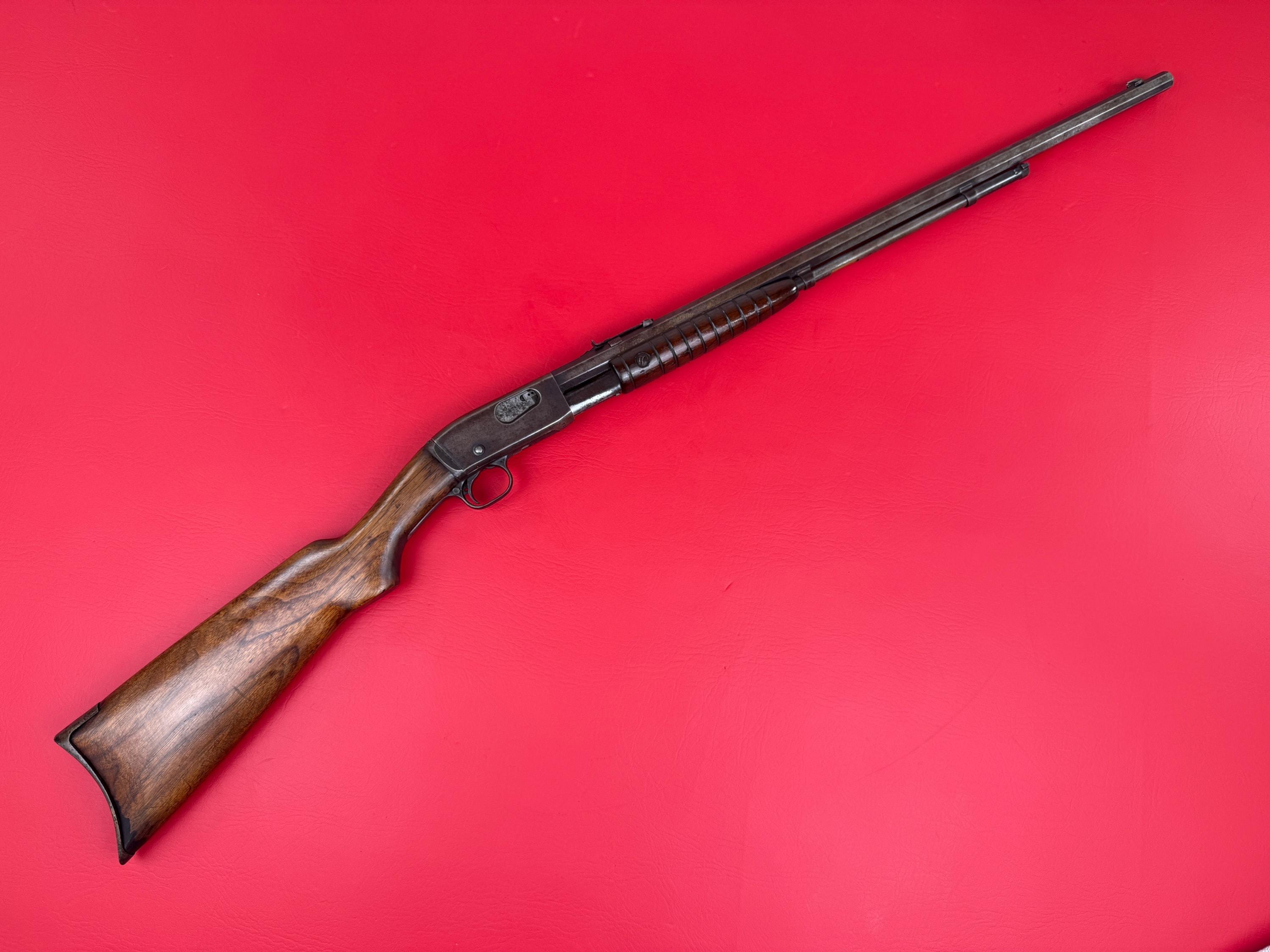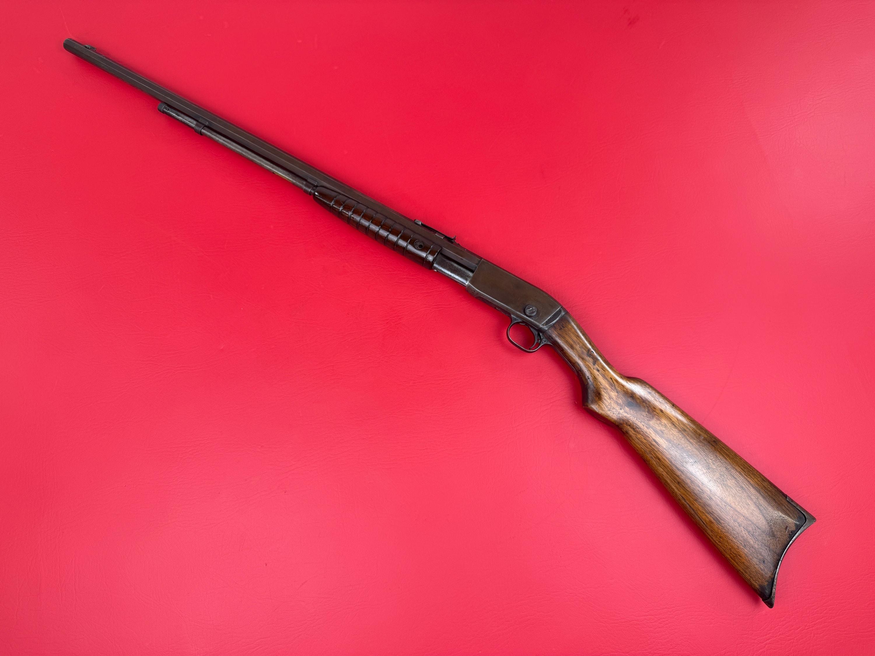 This Remington Model 12-C is a fine example of a classic American pump-action .22, chambered for .22 Short, Long, and Long Rifle. Considering its age and use, it remains in very good condition overall. The finish shows honest wear, with a brown patina developing in several areas and light pitting present throughout, giving it that well-loved vintage character. The walnut stock is in fair condition, with typical handling marks consistent with decades of use. Mechanically, it cycles properly, maintaining the smooth pump action the Model 12 series is known for. The front sight is bent and may need adjustment or replacement depending on your needs. The bore is dark with moderate pitting throughout, but still retains visible rifling. A solid piece for collectors or enthusiasts looking for a genuine example of early 20th-century Remington craftsmanship. With a bit of care, this one still has stories left to tell.