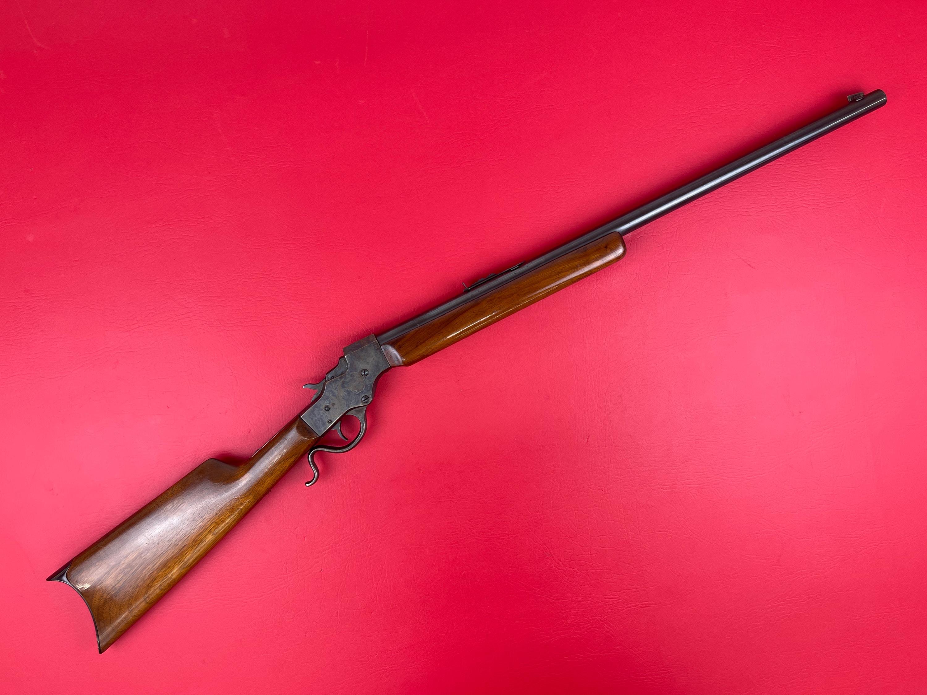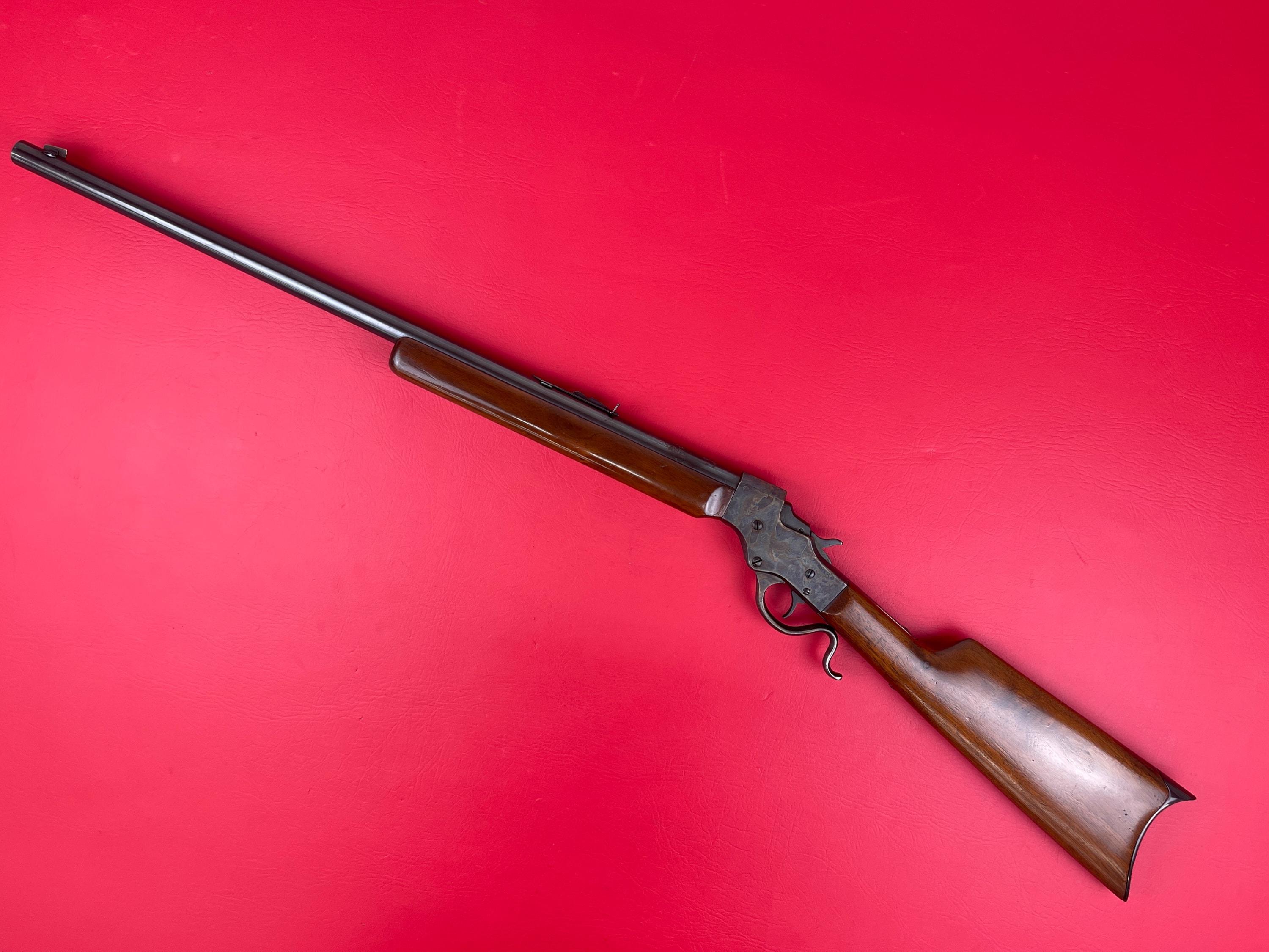 Stevens Model 44 .25RF — very good condition for its age. Barrel and receiver show light speckling throughout but nothing major; stock is in good shape, and the bore is clean. Single-shot falling-block action.