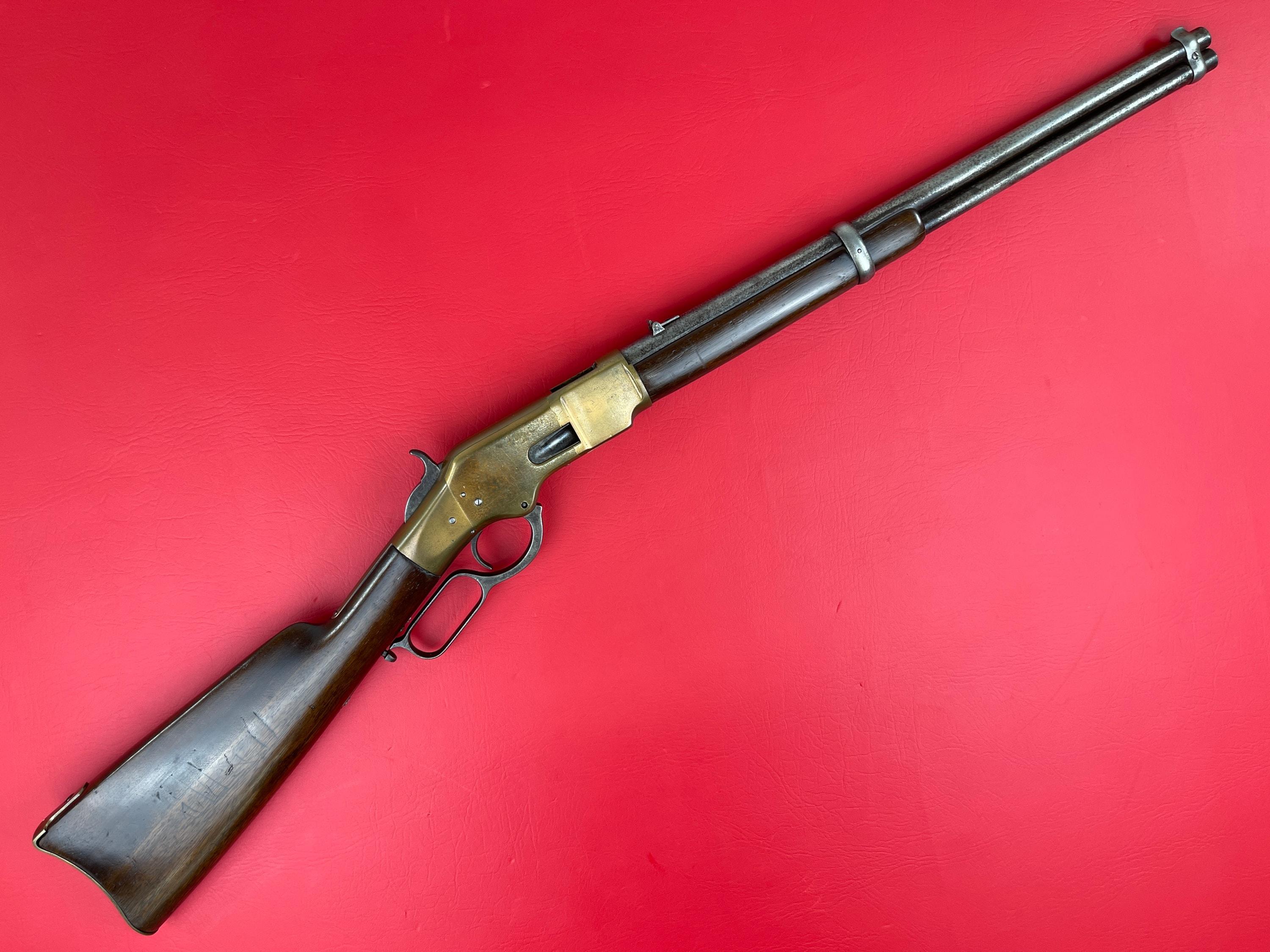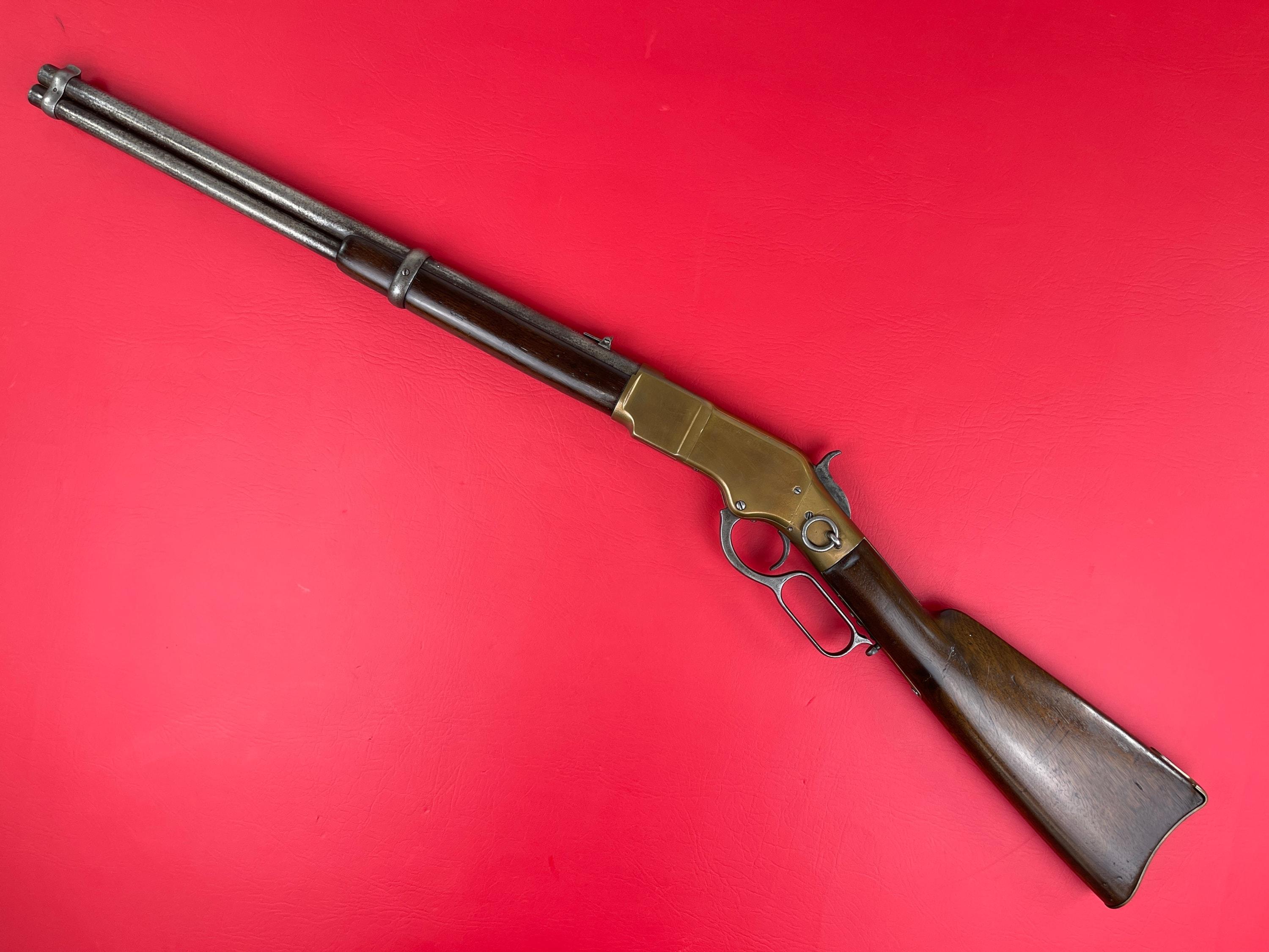 This Winchester Model 1866 Saddle Ring Carbine, manufactured in 1875, is a well-preserved example of one of the most historic lever-action rifles of the 19th century. Chambered in .44 Henry Rimfire, this carbine features a 20-inch barrel, a design favored for its compact size and quick handling. The rifle remains in very good condition for its age, retaining its original brass receiver, which still holds its classic warm patina. The barrel and magazine tube were originally blued, but now exhibit a naturally aged, worn finish. The bore has pitting throughout but retains strong rifling, indicative of its continued preservation. The walnut stock shows honest handling marks throughout, consistent with its age and use. There is a crack underneath the forearm, but the stock remains solid. All major blemishes have been documented in the provided photos. Overall, this is a desirable Winchester 1866 SRC, offering both collectors and enthusiasts a great representation of a true Old West classic.