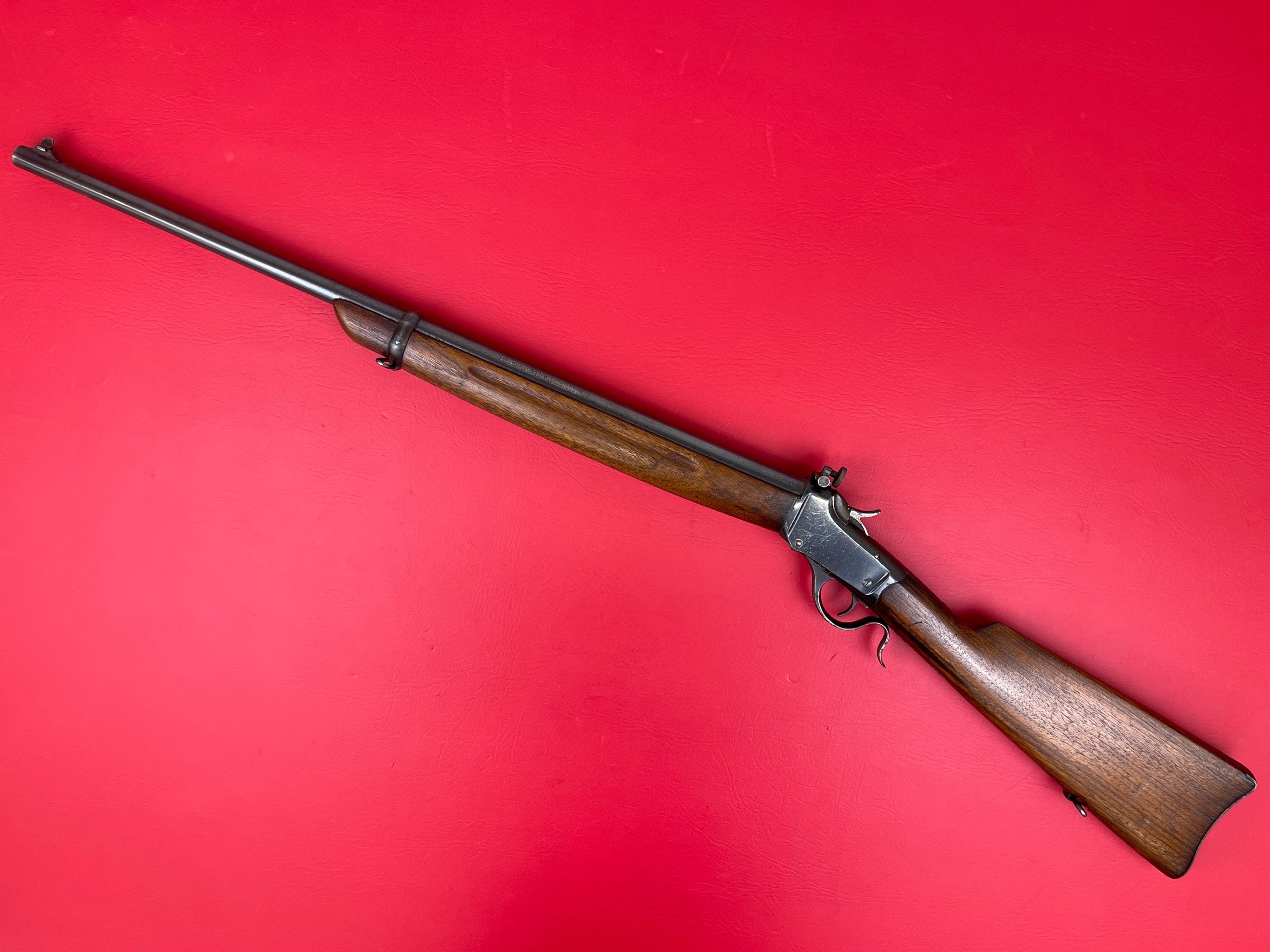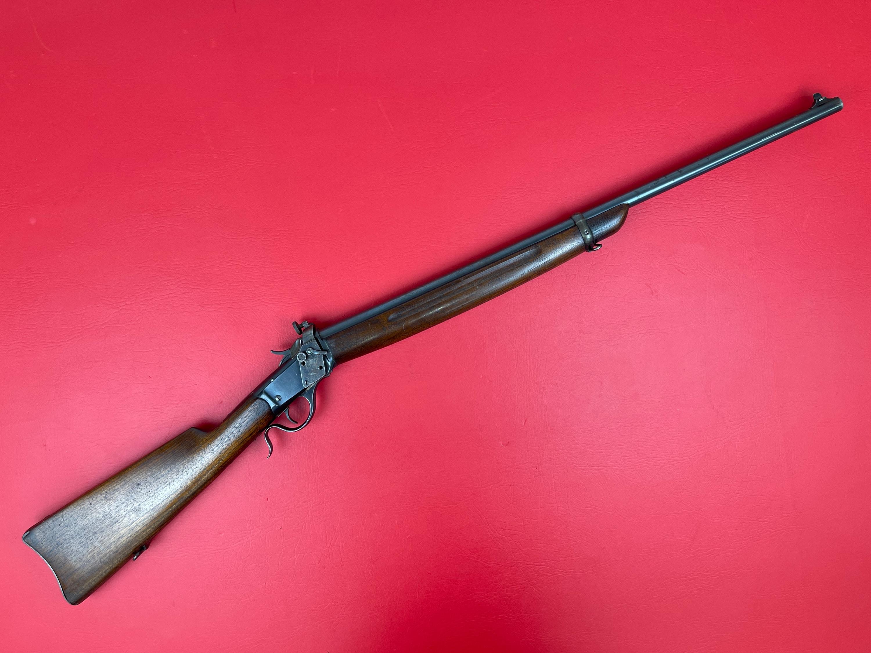 1908–1910 Winchester Rolling Block .22 Short — good condition, worn bluing with rust speckling, stock handling marks, clean bore & strong rifling. Overall, in good condition.